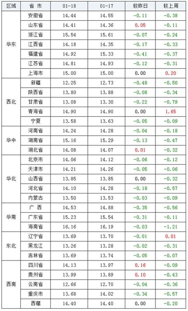 相较上周(2022年01月11日)14.51元/公斤,价格下跌0.28元/公斤;