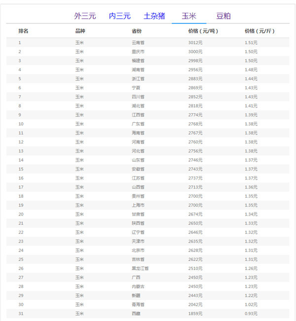 上涨地区(14个):山东省、江西省、福建省、新疆维吾尔自治区、甘肃省、宁夏回族自治区、河南省、湖南省、北京市、天津市、河北省、吉林省、四川省、云南省;玉米价格较昨日上涨1-85元/吨;