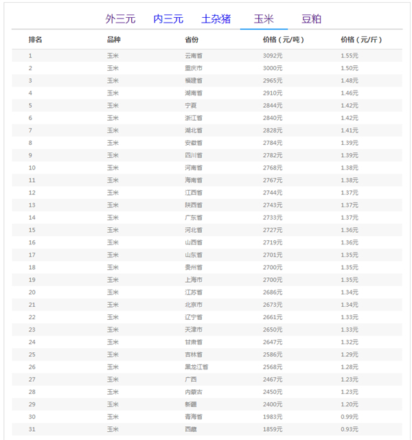 全国玉米(饲料原料)价格涨跌表