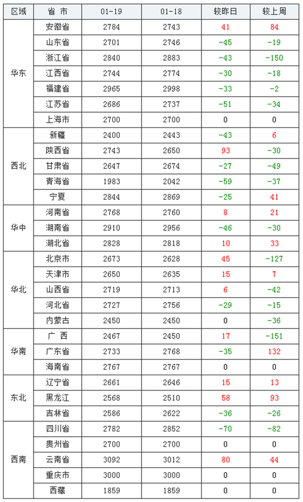 相较去年(2021年01月19日)2810元/吨,价格下跌94元/吨。