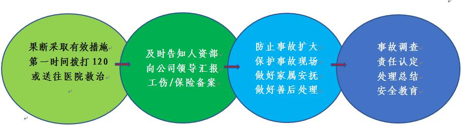 安全事故发生后,果断采取有效措施,同时第一时间拨打120急救电话或送往医院救治;及时告知公司人力资源部并向公司领导汇报,进行工伤或保险备案;采取有效措施防止事故进一步扩大、保护好事故现场、安抚好家属、做好善后处理;召开专题会议对安全事故原因进行调查分析、责任认定、处理总结、安全教育。
