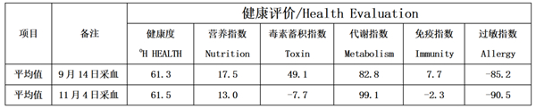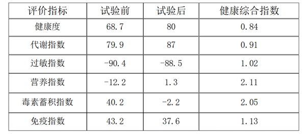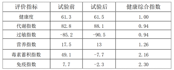 试验结果可见,改变最明显的是“毒素蓄积指数”。但因6大指标数量级不同,无法观察试验前后差异变化是否显著,于是引入【健康综合指数】评价法:健康综合指数=1-(试验后-试验前)/实验前×100%