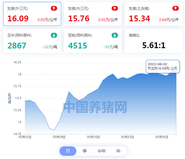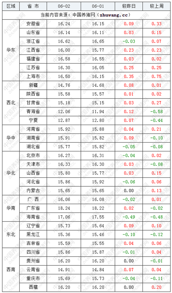 相较昨日(2022年06月01日)16.06元/公斤,价格上涨0.03元/公斤;