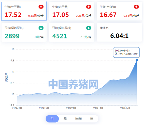 相较昨日(2022年06月22日)17.14元/公斤,价格上涨0.38元/公斤;