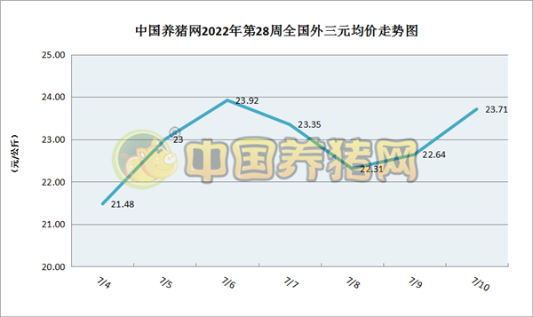 猪价系统数据监测,2022年第28周(2022年07月04日至2022年07月10日)全国外三元生猪价格走势先涨后跌再涨,呈偏强震荡调整态势,周初期至周中期大幅反弹,周中期至周末期先跌后涨。本周猪价区间在21.48-23.92元/公斤之间!周初猪价为21.48元/公斤,周末猪价为23.71元/公斤,全周猪价累计上涨了2.23元/公斤。