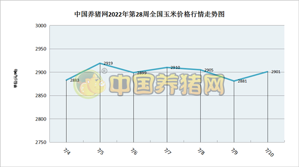 猪价系统数据监测,2022年第28周(2022年07月04日至2022年07月10日)本周我国玉米价格下起伏较大,周初期至周中期快速上涨,周中期至周末期先跌后涨。全周玉米价格区间在2881-2919元/吨,周初期玉米价格为2883元/吨,周末期价格为2901元/吨,全周玉米价格累计上涨了18元/吨。