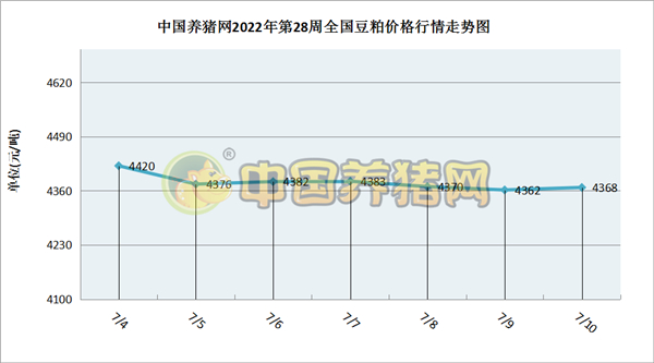 猪价系统数据监测,2022年第28周(2022年07月04日至2022年07月10日)本周豆粕价格行情走势持续下滑,周初期周末期窄幅下跌。全周豆粕价格区间在4358-4420元/吨之间,周初豆粕价格为4420元/吨,周末价格为4362元/吨,全周豆粕价格累计下跌了58元/吨。