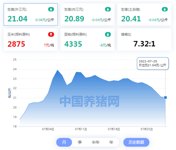 相较昨日(2022年07月28日)21.12元/公斤,价格下跌0.08元/公斤;