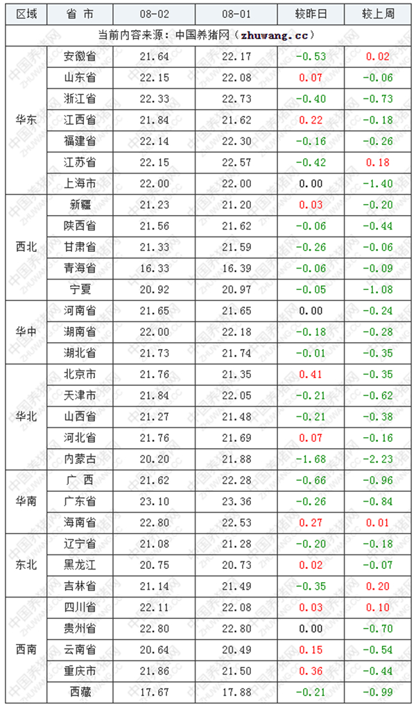 相较昨日(2022年08月01日)21.98元/公斤,价格下跌0.15元/公斤;