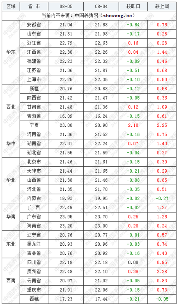 相较昨日(2022年08月04日)21.88元/公斤,价格下跌0.07元/公斤;