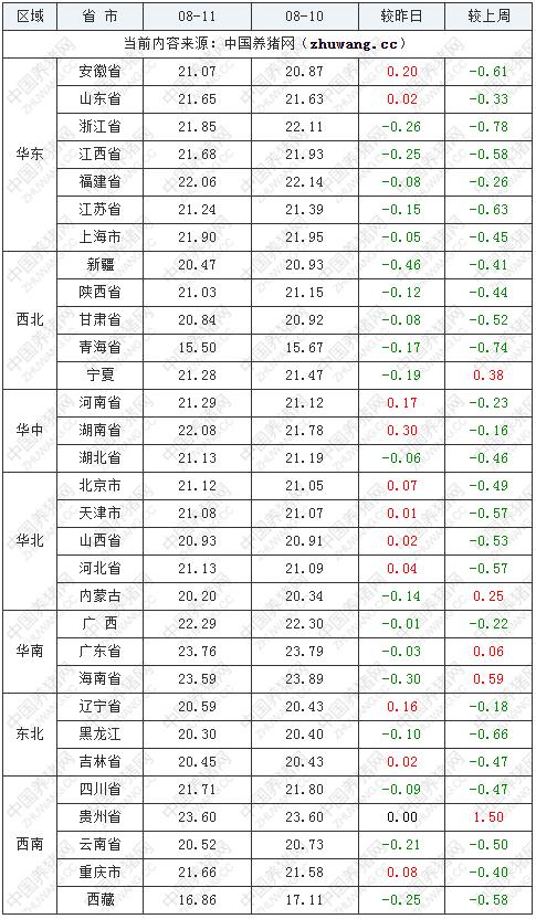 相较昨日(2022年08月10日)21.52元/公斤,价格下跌0.03元/公斤;
