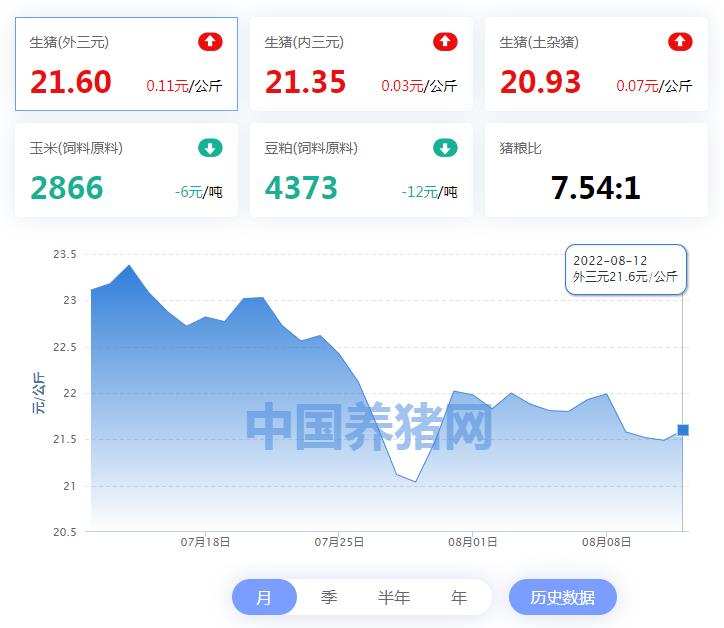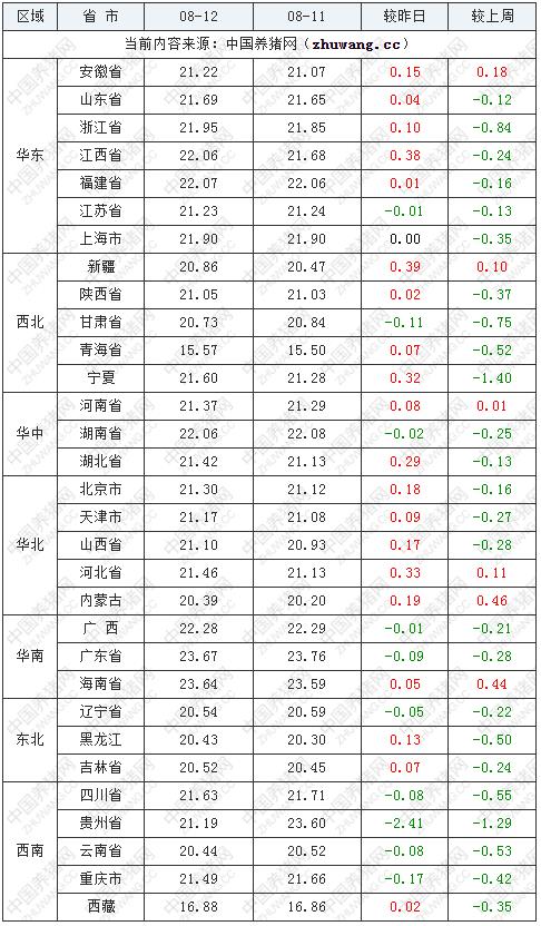 相较昨日(2022年08月11日)21.49元/公斤,价格上涨0.11元/公斤;