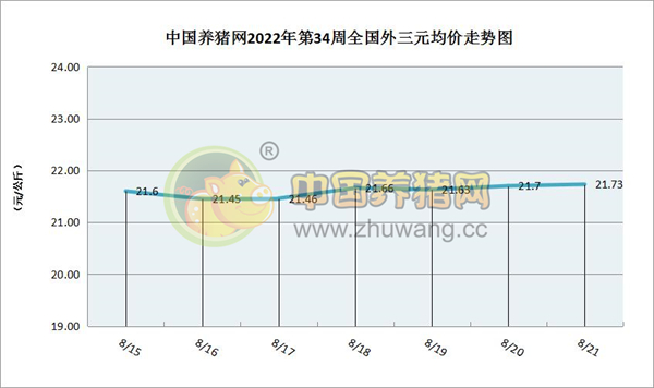 猪价系统数据监测,2022年第34周(2022年08月15日至2022年08月21日)全国外三元生猪价格走势窄幅上涨,较为平缓。周初期至至周末期先跌后涨,保持在9.5-10元中间震荡。本周猪价区间在21.45-21.73元/公斤之间!周初猪价为21.60元/公斤,周末猪价为21.73元/公斤,全周猪价累计上涨了0.13元/公斤。