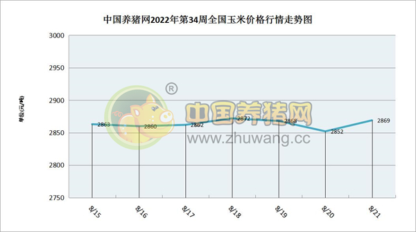 猪价系统数据监测,2022年第34周(2022年08月15日至2022年08月21日)本周我国玉米价格窄幅震荡,周初期至周中期较为平稳,周中期至周末期先跌后涨。全周玉米价格区间在2852-2872元/吨,周初期玉米价格为2863元/吨,周末期价格为2869元/吨,全周玉米价格累计上涨了6元/吨。
