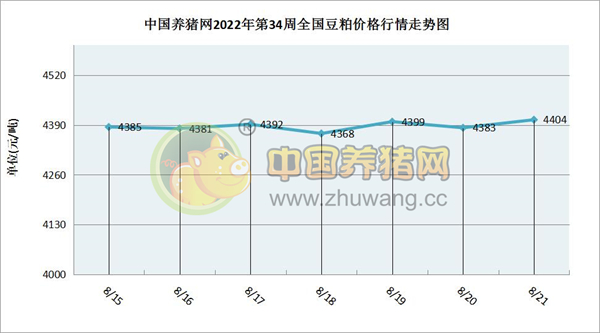猪价系统数据监测,2022年第34周(2022年08月15日至2022年08月21日)本周豆粕价格稳中上行,周初期至周末期全周走势平缓,没有较大的涨跌幅度。全周豆粕价格区间在4368-4404元/吨之间,周初豆粕价格为4385元/吨,周末价格为4404元/吨,全周豆粕价格累计上涨了19元/吨。