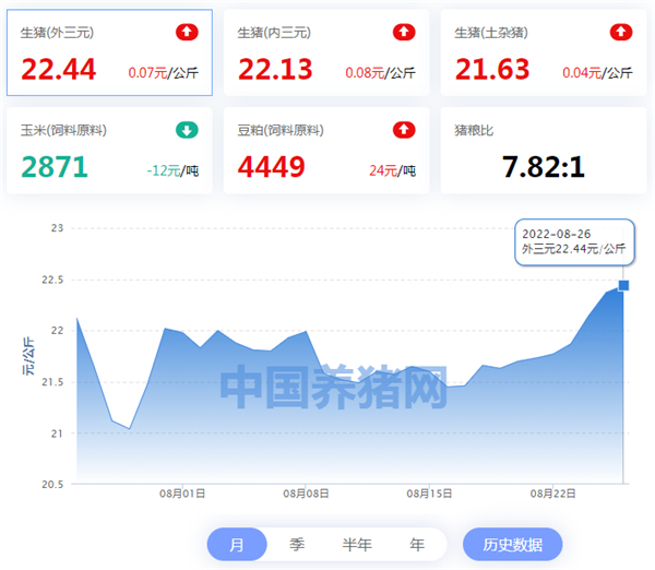 相较昨日(2022年08月25日)22.37元/公斤,价格上涨了0.07元/公斤;