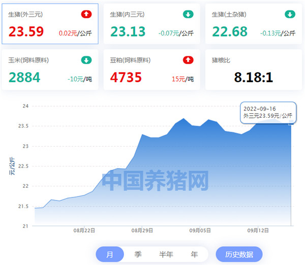相较昨日(2022年09月15日)23.57元/公斤,价格上涨了0.02元/公斤;
