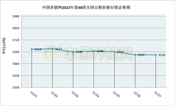 猪价系统数据监测,2022年第48周(2022年11月21日至2022年11月27日)本周豆粕价格除周内较为平稳,周初小幅上涨,周中高位震荡,周末小幅走跌。全周豆粕价格区间在5556-5623元/吨之间,周初豆粕价格为5618元/吨,周末价格为5556元/吨,全周豆粕价格累计下跌了62元/吨。