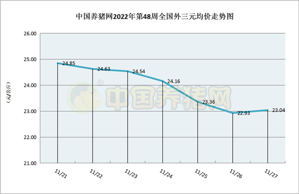猪价系统数据监测,2022年第48周(2022年11月21日至2022年11月27日)全国外三元生猪价格周初呈现小幅下跌走势,周中“坍塌式”下跌,周末局部地区小幅回温,幅度不大。本周猪价区间在22.93-24.85元/公斤之间!周初猪价为24.85元/公斤,周末猪价为23.04元/公斤,全周猪价累计下跌了1.81元/公斤。
