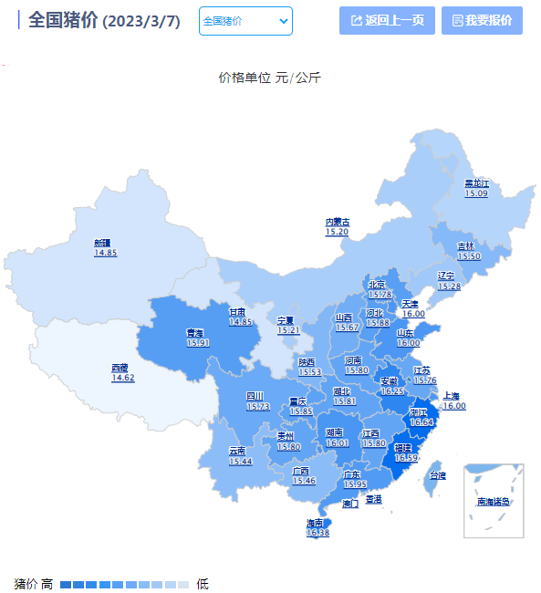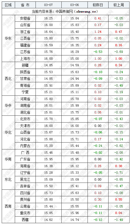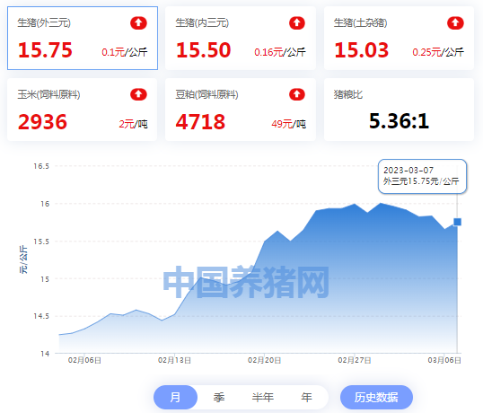相较昨日(2023年03月06日)15.65元/公斤,价格下上涨了0.10元/公斤;