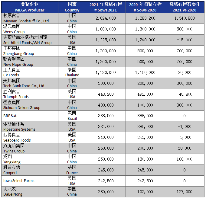 我国15家猪企母猪存栏超10万!2021年全球养猪企业排行榜公布