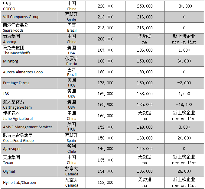 牧原食品、温氏集团、正邦集团、新希望集团、天邦集团、德康集团、双胞胎集团、扬翔、大北农、中粮、傲农集团、佳和农牧、天康集团、大象农牧、唐人神集团。