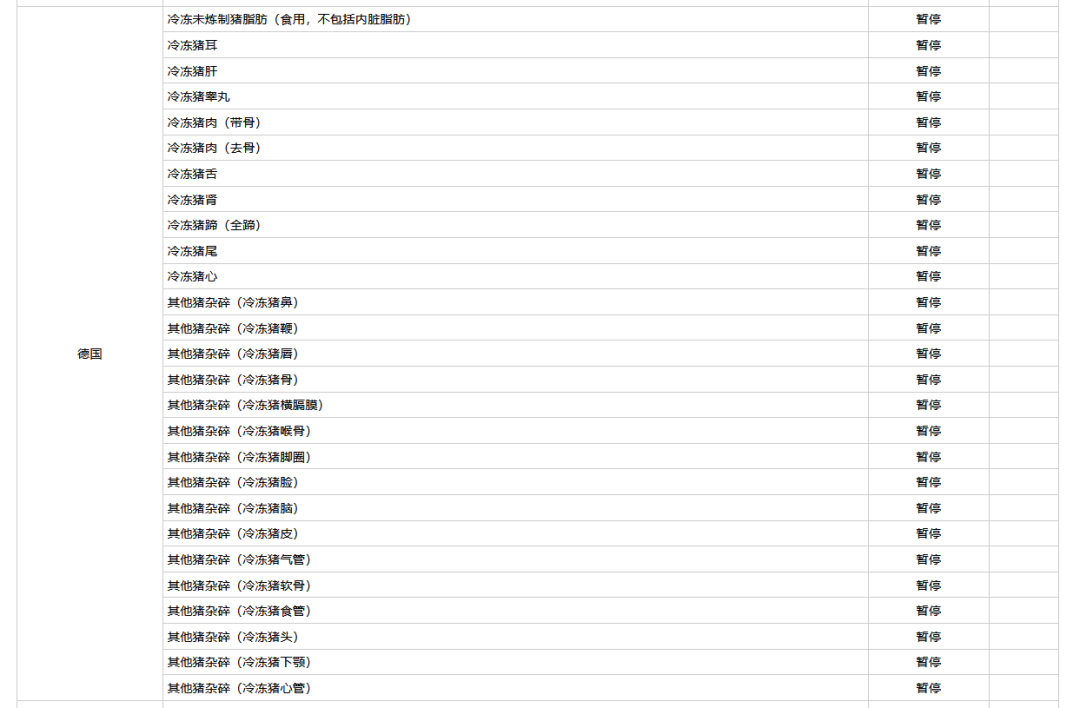 此前,有媒体统计,德国确诊非瘟的野猪已超1000例,其中有900多例都位于本次家猪感染非洲猪瘟的勃兰登堡州。我国对德国肉类进口的关口也一直没有松懈,《农财宝典》新牧网记者查阅海关总署网站发现,目前我国对德国肉类产品进口的状态均为“暂停”。
