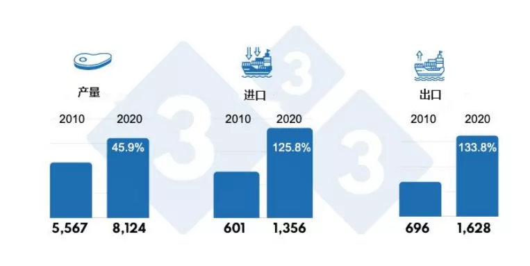 生产, 从2010年的556.7玩吨到812.4万吨,2020年综合增长率为44.9%,年均增3.5%(图1和图3)。