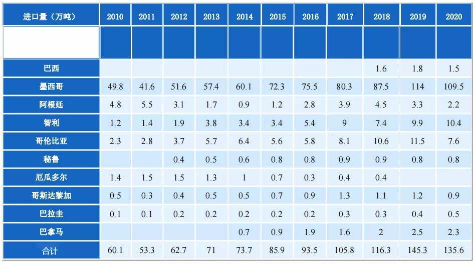 在进口方面,巴西是一个特殊例子,它不仅能够自给自足,而且能够大量出口,过去的3年里一直在减少其进口。值得注意的是,拉丁美洲,进口增长速度比生产更高(125%),从2010年60.07万吨增至2020年135.65万吨 (图1和图3)。表明该地区国内消费的很大一部分是由其他国家供应的,特别是墨西哥、哥伦比亚、哥斯达黎加和巴拿马等国家。