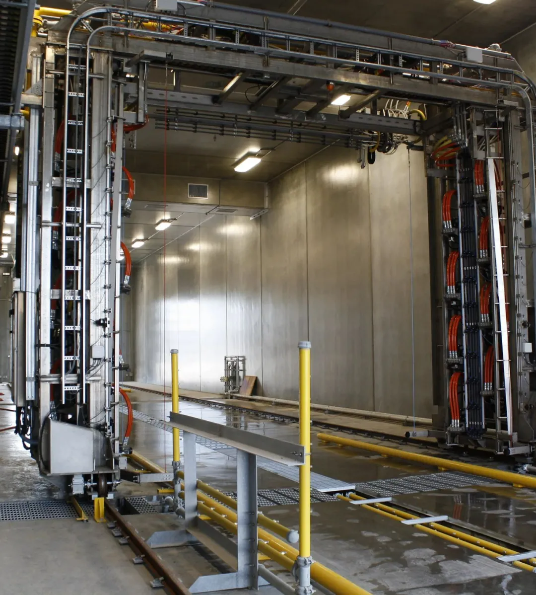 对此加拿大一家公司开发出了一种创新性的解决方案,期望能够通过技术手段来降低该过程的成本。具体说是一种卡车洗消间,该洗消间中的主体结构是一个龙门架式的洗消装置,不同用途的管线和喷头挂载在龙门架上,通过龙门架的前后移动,完成卡车的外部洗消工作。