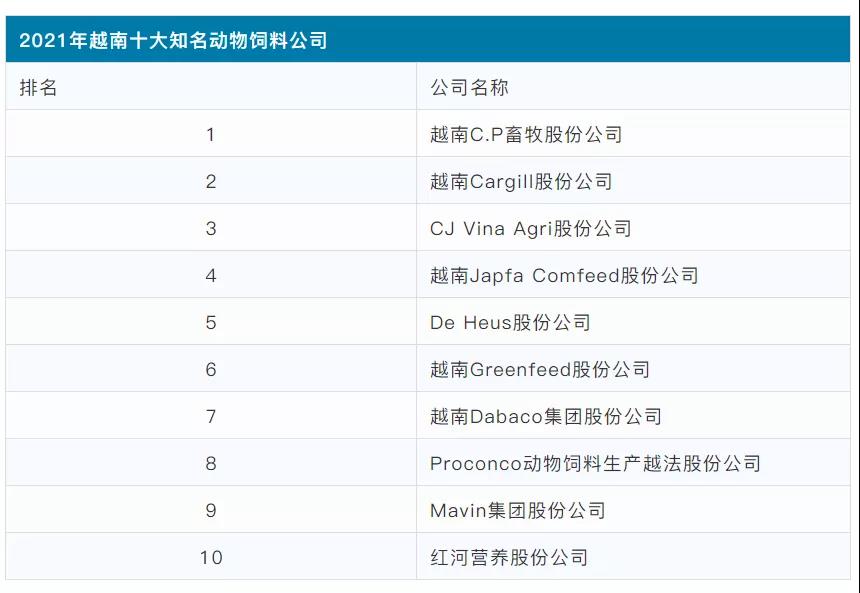 另外,近期越南报告股份公司(Vietnam Report)日前公布了2021年十大知名动物饲料公司排名。