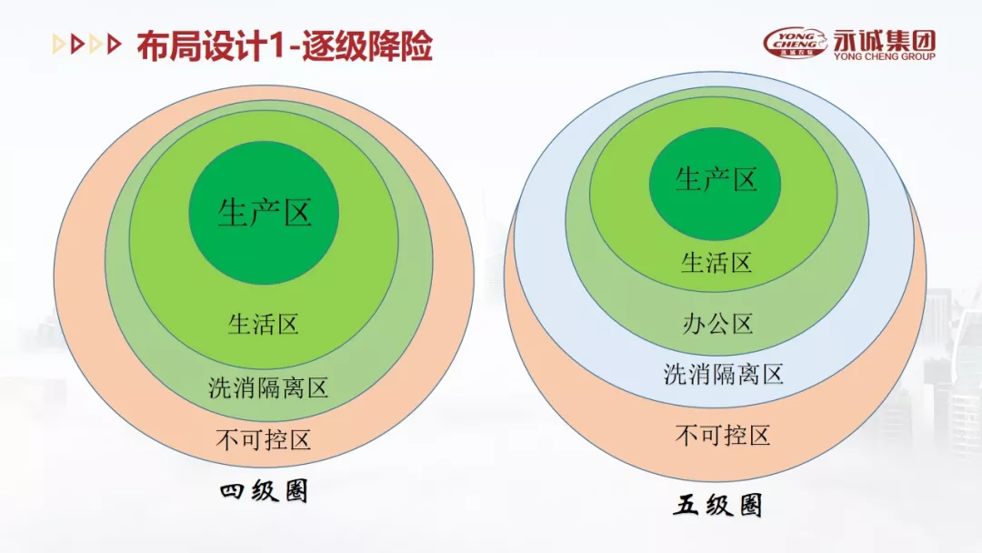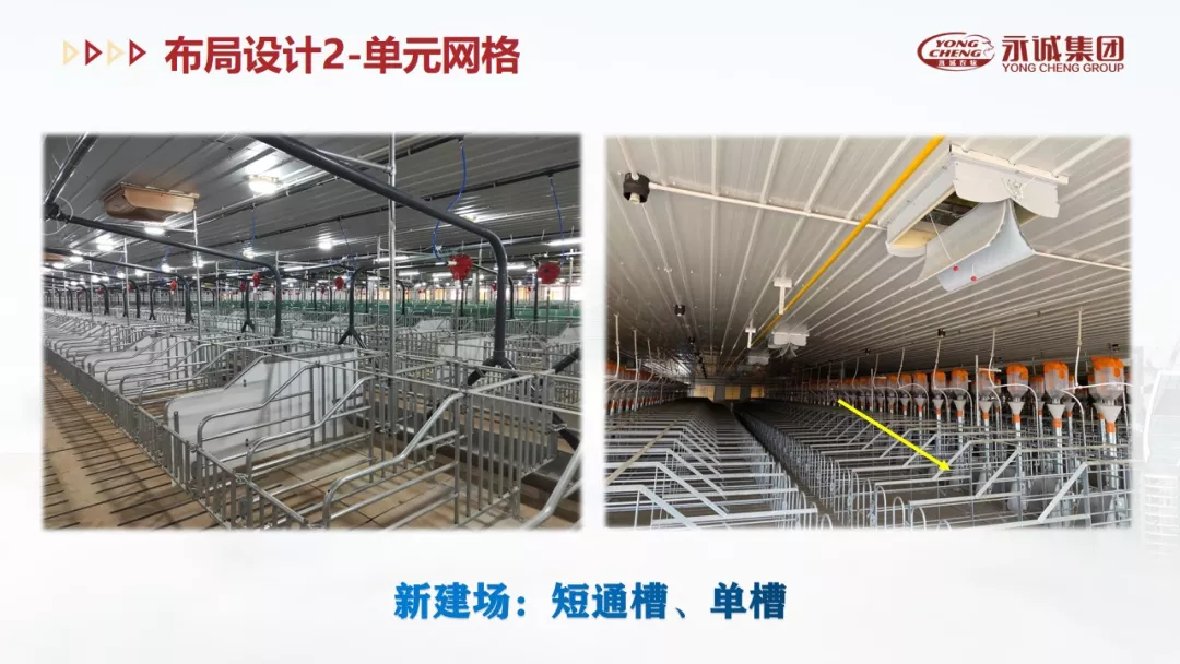 里分风险不可控区、洗消隔离区、办公区、生活区和生产区等,逐级降险;二是采取“大栋小单元”的模式,以短通槽、单槽、实体隔栏等减少接触传播风险,在单元网格发生疫病风险时进行精准剔除可减少损失;三是将净道与污道分开;四是转运过程减少人力,方便操作,降低内外交叉污染风险。