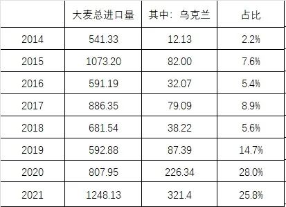 乌克兰是我国玉米和大麦主要进口来源。2015-2019年占玉米进口总量比重均在60%以上,2020年和2021年分别为55.8%和29%。大麦近3年进口量增量明显,从2018年以前的不足10%增至2020年和2021年的28%和25.8%。
