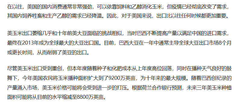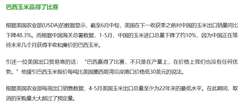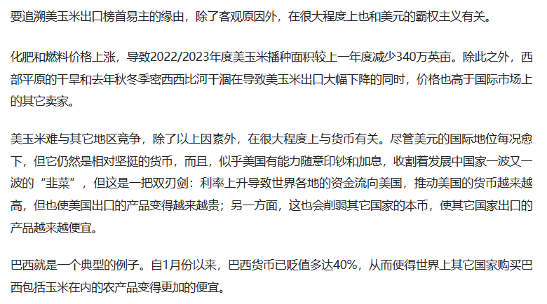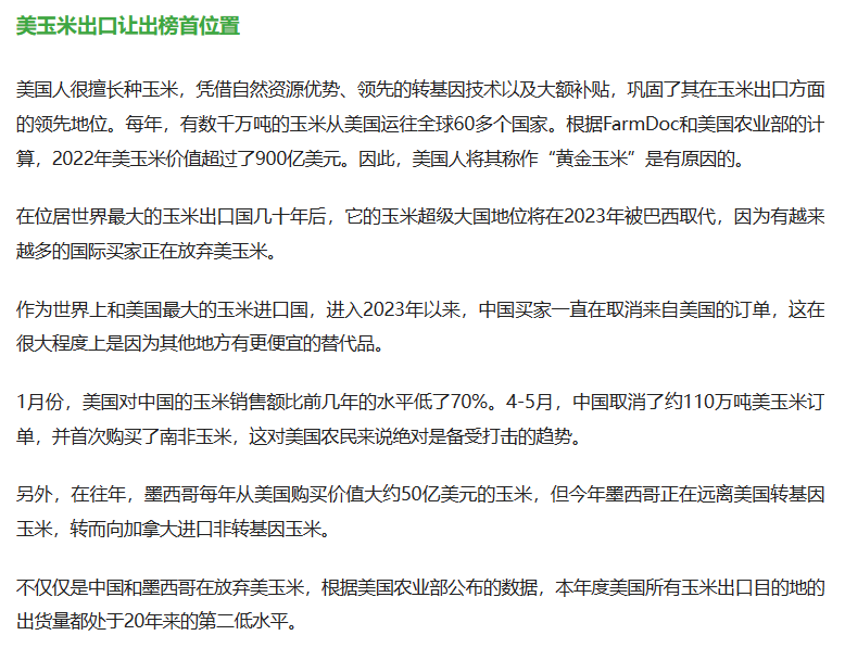 但随着俄乌危机爆发,以及巴西玉米的崛起,美玉米在全球贸易市场的主导地位正在减弱,巴西在与中国达成的新供应协议的帮助下,本年度玉米出货量将是自2013年以来,第二次超越美国,成为全球第一大玉米出口国。