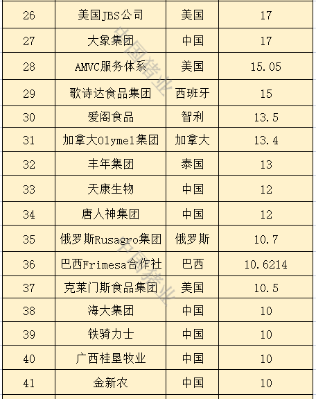 排名前20的企业中,中国占了11家,其中双胞胎、傲农、扬翔股份、中粮集团、大北农排名位于11到20名之间。