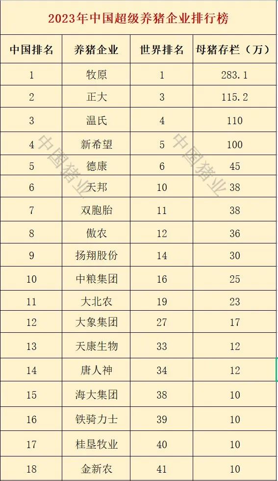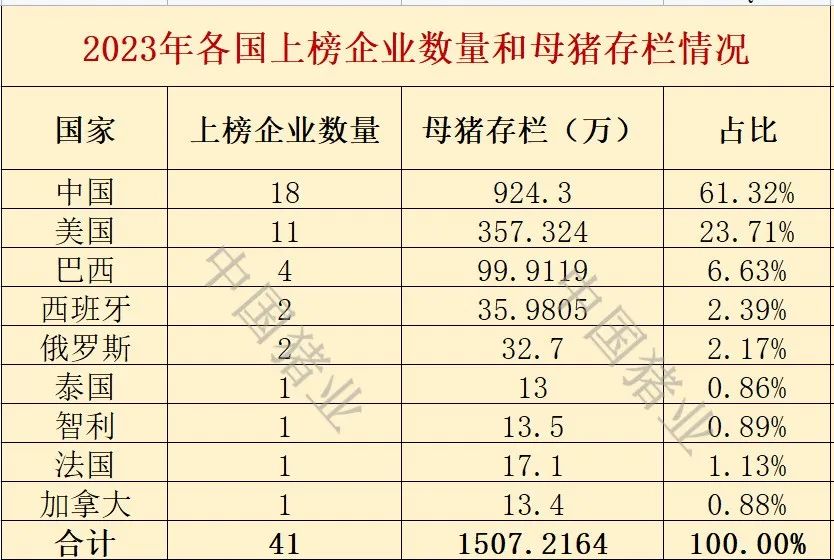 本年度的全球养猪企业排行榜(能繁母猪存栏10万头及以上)出炉!其中有41家养猪企业上榜,他们分别来自9个国家,其中,中国上榜18家、美国上榜11家,巴西上榜4家,西班牙和俄罗斯上榜各2家,泰国、智利、法国和加拿大上榜各1家。