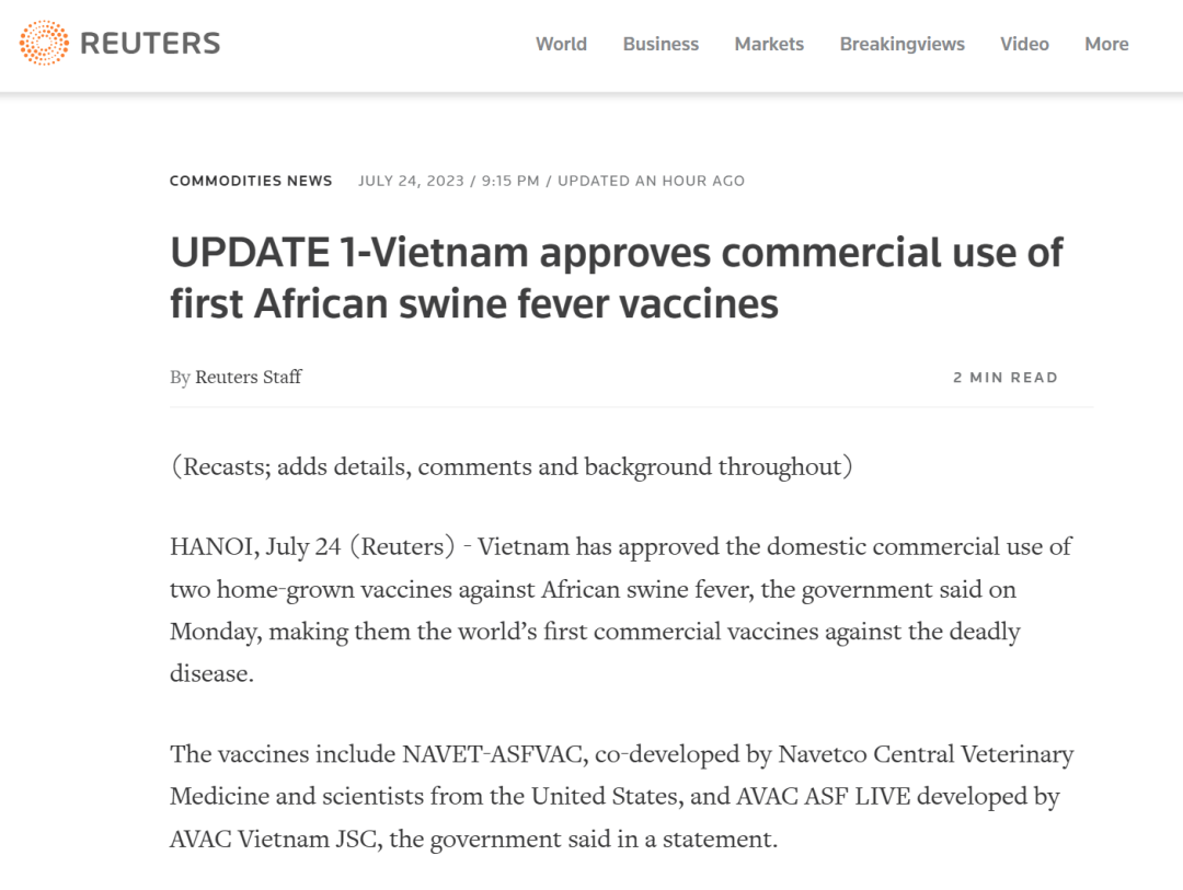 越南政府在声明文件中表示,两款批准的疫苗分别是:NAVET-ASFVAC,由越南中央动物药业股份公司(Navetco)与美国学者合作开发;另一款为AVAC ASF LIVE,由AVAC公司开发。