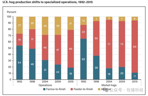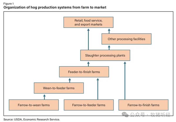 传统上,猪从出生到屠宰都在一个农场饲养。但生产上,只从事一两个生产阶段的饲养模式变得越来越多。养殖不仅向专业化分工转变,同时还伴随着合同养殖的广泛发展以及更大规模的养殖场出现。随着合同饲养的增加,后期生产阶段的专业化(如育肥)变得更加普遍,承包商提供饲料、保育猪以及服务。