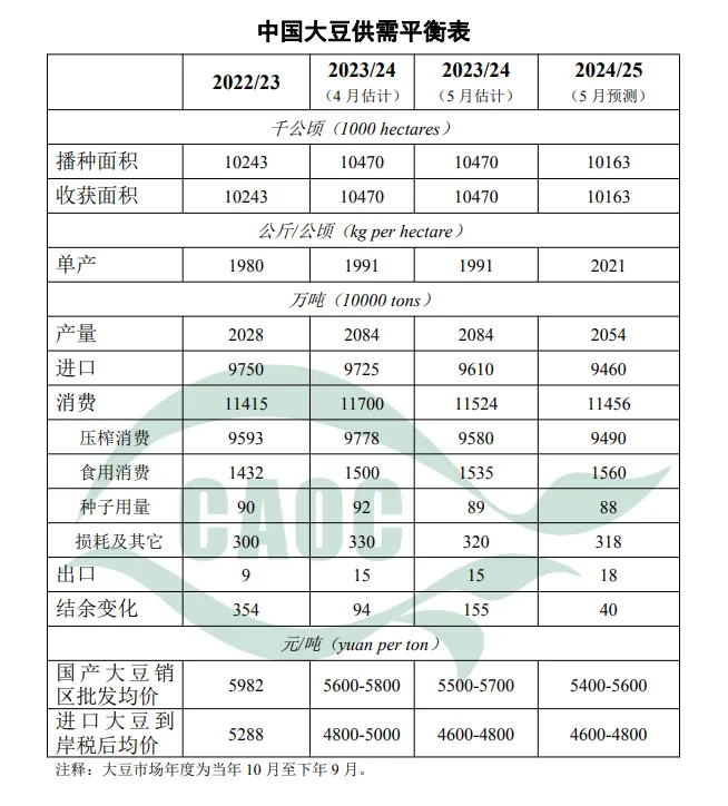 国产大豆上季种植收益低于农户预期,但国家“稳大豆”的政策导向不变,生产者补贴等支持政策继续向大豆倾斜,同时,全国粮油等主要作物大面积单产提升行动稳步推进,大豆生产有望保持基本稳定。截至5月上旬,东北产区大豆春播进展顺利,除黑龙江中西部局地略旱外,土壤墒情总体良好。预计2024/25年度中国大豆播种面积10163千公顷,较上年度减少2.9%;单产每公顷2021公斤,较上年度提高1.5%;产量保持在2000万吨以上。