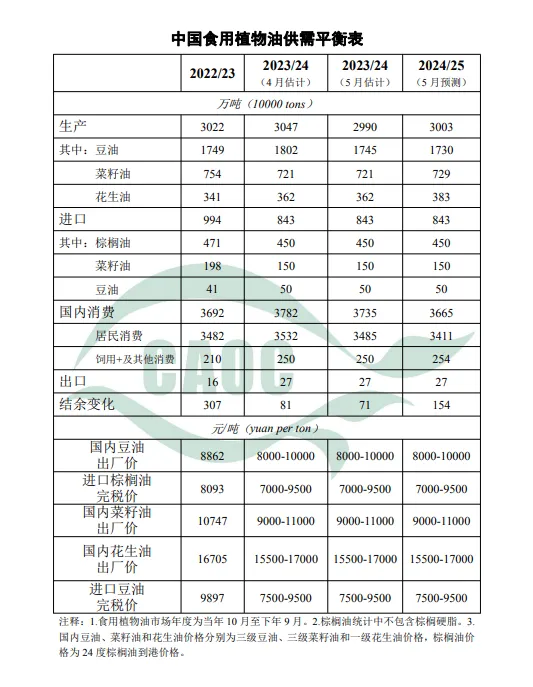 食用植物油国内消费量3735万吨,比月估计值下调48万吨,主要是因为人均消费量不及预期。进出口量均与上月估计值一致。本月预测,2024/25年度,中国食用植物油产量3003万吨,比上年度增加13万吨,其中豆油产量1730万吨,比上年度减少15万吨,主要是因为大豆进口量和压榨消费量减少;油菜籽和花生产量预期增加,带动菜籽油、花生油比上年度分别增加8万吨、21万吨。国内消费量3665万吨,比上年度减少70万吨,其中,居民消费量减少74万吨,主要是受人口总量减少和健康消费理念普及等因素的综合影响;饲用及其他消费增加4万吨。