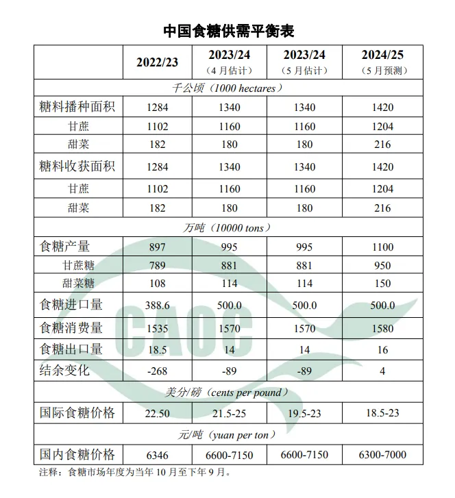 本月,2023/24年度中国食糖生产即将结束,得益于南方甘蔗单产大幅提升,全国食糖产量恢复性增长;国际食糖供应预期趋于好转,国际食糖价格预估区间下调至19.5-23美分/磅。由于糖料种植效益好转,与竞争性作物的比较优势凸显,农民种植积极性提升,天气条件总体正常,本月预测2024/25年度甘蔗播种面积持平略增,甜菜播种面积大幅增加,食糖产量保持恢复性增长,有望增至1100万吨,消费量基本持平,国内食糖产需缺口缩小。