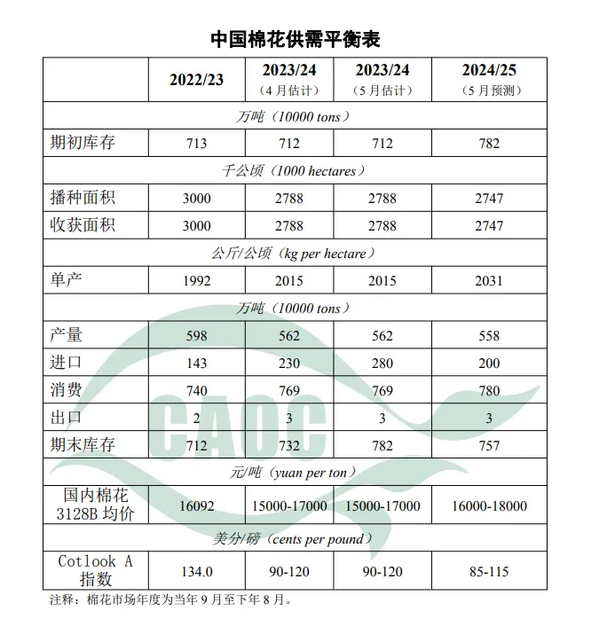 棉花播种出苗期间主产区综合气候条件适宜,预计单产为每公顷2031公斤(每亩135公斤),较上年度增0.8%。棉花产量为558万吨,较上年度减0.7%。国际货币基金组织(IMF)预测2024年和2025年全球经济增速将保持在3.2%左右,国内外经济持续向好,市场对棉花消费恢复预期增强。预计新年度中国棉花消费量为780万吨,较上年度增1.4%,进口量为200万吨,期末库存降至757万吨。