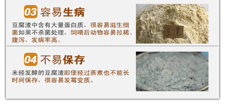 不发酵的生豆渣能存放3天左右,夏季保存时间更短,经过农富康豆渣发酵剂发酵后的豆渣,如果能做到严格密封,压紧压实的情况下,则可以保存一年以上。
