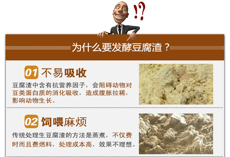 水分是豆渣发酵饲料的关键,50%水分为佳,水分太大发酵后太酸,动物不爱吃,水分太小,发酵慢。