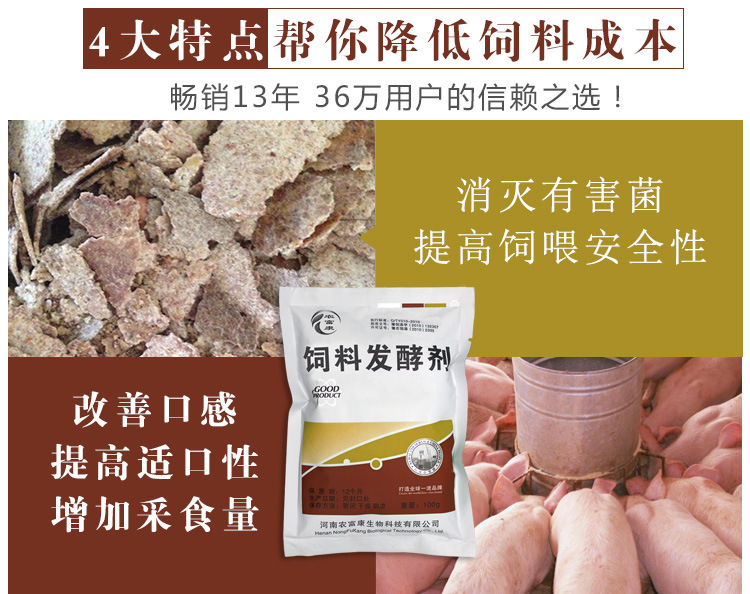 1.农富康饲料发酵剂发酵花生饼,可有效降低花生饼中的有害物质,降低饲料成本!改善动物适口性,猪更爱吃。