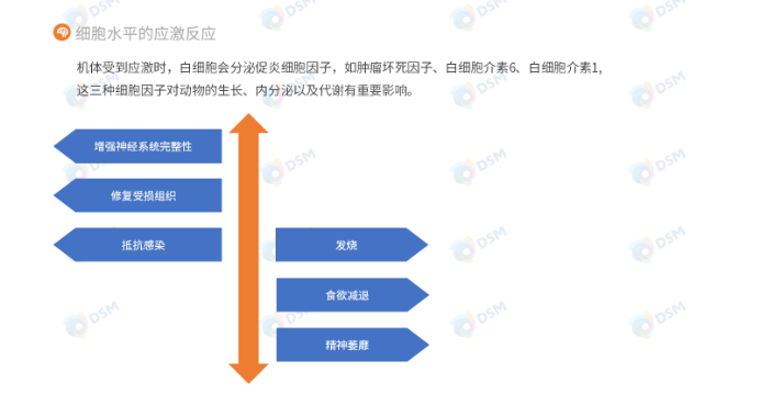 机体受到应激时,白细胞会分泌肿瘤坏死因子(TNF-α)、白细胞介素6(IL-6)、白细胞介素1(IL-1)。这三种细胞因子对动物的生长、内分泌以及代谢有重要影响。
