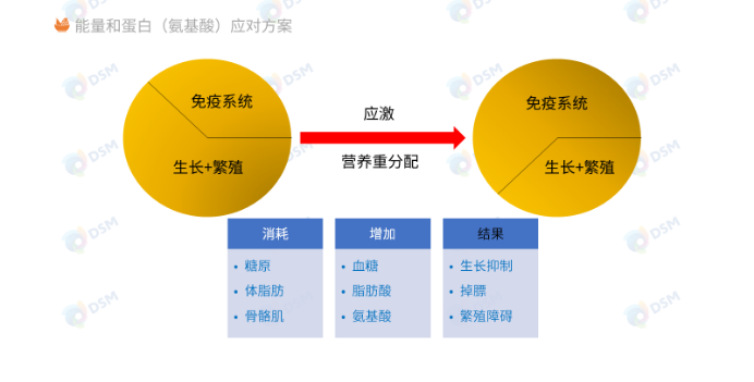 1)猪群处于应激状态时血糖、血液游离脂肪酸、氨基酸水平提高,需要消耗大量的能量与蛋白质。外周蛋白质分解代谢增强,产生的氨基酸主要被肝脏摄入合成急性期蛋白与其他免疫物质,这些氨基酸60%是由骨骼肌蛋白分解而来。因而处于应激状态时猪群生长受到抑制、甚至出现掉膘现象。
