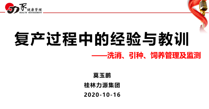 二、复产过程中的经验与教训-洗消、引种、饲养管理及监测,莫玉鹏,广西力源集团
