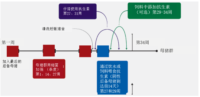 • 确保后备母猪在引入养殖场后尽早接触到所有的地方性养殖场病原体:支原体、PRRS等。