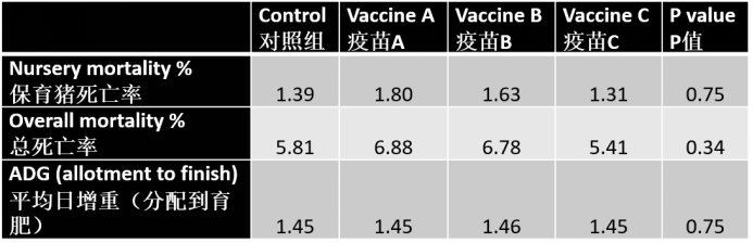 不同的处理批次间的猪只体重、平均日增重或死亡率无显著差异